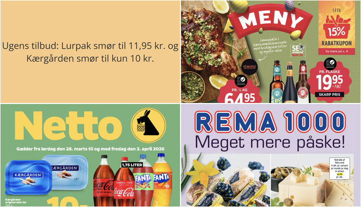 Netto tilbyder Kærgården smør, original eller let, til en skarp pris af 10 kr. pr. stk. Der er en begrænsning på maksimalt 3 stk. pr. variant pr. kunde pr. dag. Tilbuddet løber fra lørdag den 28. marts til fredag den 3. april.
